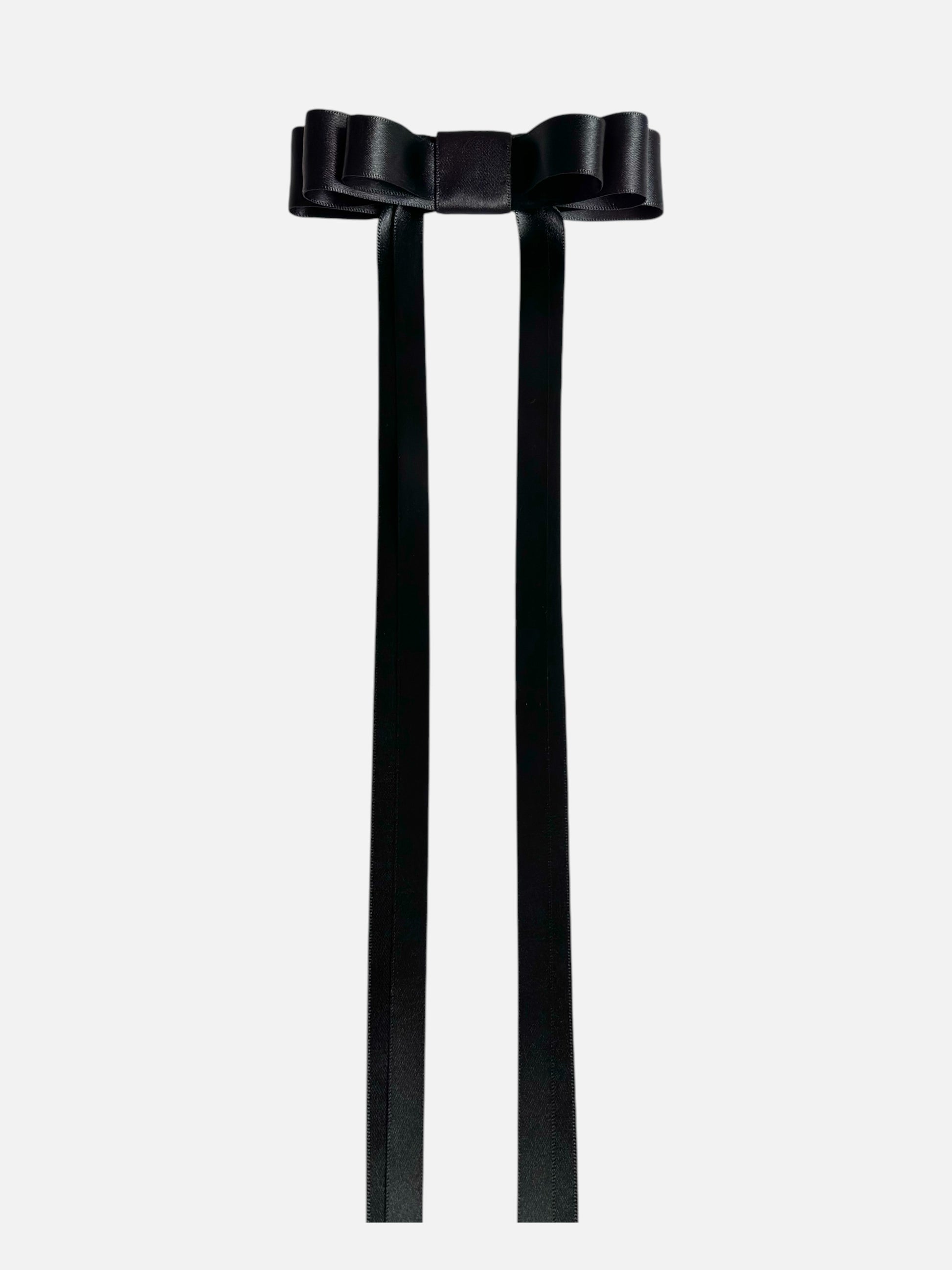 The black hair bow is made to order and hand-sewn in our Brooklyn studio using premium Japanese double-face satin ribbon. Secured to a metal French barrette made in France.